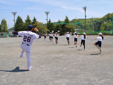 25日(火)、元選手で現球団職員の山部太氏、河端龍氏が東京都八王子市にある市立長沼小学校を訪問。毎年春ごろに行われる「スポーツテスト」に向けて、児童たちへ正しいボールの投げ方を指導しました。