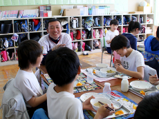 授業後は山部氏が6年2組、河端氏が6年1組の教室を訪れ一緒に給食を食べました。山部氏は「塾で何勉強してるの?」と質問したり、おかわりをした児童に対し、「いいね!大盛だね。たくさん食べないと大きくなれないもんね!」と声を掛けるなど積極的にコミュニケーションを取っていました。一方河端氏は、児童からの「野球で一番大事なことはなんですか?」との問いに対し、「野球だけに限らないけど、準備かな。テスト受ける時も、ちゃんと勉強してから受けないといい点数取れないよね。それと同じで、活躍したいと思ったらちゃんと練習して、準備体操もして、試合に臨む。そういう手順を踏んでいくのが大事だと思います」と話しました。