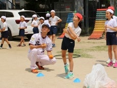11日(木)、元選手で現球団職員の山部太氏、河端龍氏が東京都品川区にある区立大原小学校を訪問。毎年春ごろに行われる「スポーツテスト」に向けて、低学年と中学年の児童たちへ正しいボールの投げ方を指導しました。