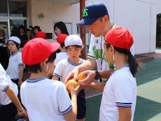 12日(金)、元選手で現球団職員の山部太氏、河端龍氏が東京都新宿区にある区立落合第六小学校を訪問。毎年春ごろに行われる「スポーツテスト」に向けて、全学年の児童たちへ正しいボールの投げ方を指導しました。