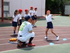 この日は全学年の児童に向け、6度の授業を実施。投げる際の身体の使い方については、「投げる時には、身体をくるっと回します。後ろ足のかかとは上を向いているかな?上を向いていたら、それは身体を上手に回せている証拠だよ」など、様々なコツを教えていきます。その後はキャッチボールや遠投、さらに2チームに分かれてのゲームも実施。同じチームの仲間に対して、「手は上に向けるんだよ!」「空見たまま投げて!」と声を掛けるなど、児童たち同士でアドバイスが飛び交っていました。授業の最後には投げ方名人認定証を授与し、投げ方教室を締めました。