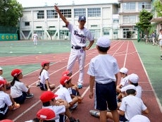 3日(土)、元選手で現球団職員の山部太氏、河端龍氏が東京都世田谷区にある区立八幡小学校を訪問。毎年春ごろに行われる「スポーツテスト」に向けて、正しいボールの投げ方を指導しました。