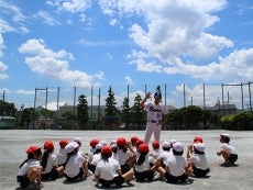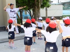5日(月)、元選手で現球団職員の山部太氏、河端龍氏が東京都練馬区にある区立練馬東小学校を訪問。毎年春ごろに行われる「スポーツテスト」に向けて、正しいボールの投げ方を指導しました。