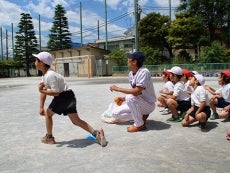 この日は1年生と2年生に向けて3度の授業を実施。1年生の授業では、河端氏が「投げる時の大事な言葉を教えるよ。1つ目は『トントン』。何の音だと思う?」と児童たちに問いかけると、「バウンドしている音!」「キャッチするときの音?」など様々な回答が上がります。それを受け、「これはね、ボールで頭を軽くたたいた時の音なんだよ」と教えると、実際にやってみた児童から「ほんとだ、『トントン』って音がする」と驚きの声が聞こえました。続いて2つ目の大事な言葉として、おへそを投げたい方向に向ける『クルッ』という音を教え、みんなで「トントン、クルッ」と声を出しながら投げ方を練習。その後、実際に壁に向かって思い切りボールを投げてもらいます。回数を重ねるごとにぐんぐん飛距離を伸ばす児童たちを見て、両氏は「一気に成長したなあ」と顔をほころばせていました。