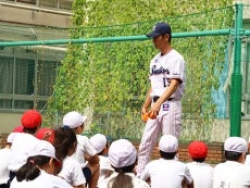 15日(金)、元選手で現球団職員の山部太氏、河端龍氏が東京都新宿区にある新宿区立落合第三小学校を訪問。毎年春ごろに行われる「スポーツテスト」に向けて、正しいボールの投げ方を指導しました。