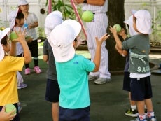 この日は年長組30名ほどの園児に対して授業を実施。投げ方の練習では、1人1球ボールを持ち、ボールをバウンドさせてキャッチしたり、身体の周りで1周させたりして、ボールに慣れてもらいます。その後はボールを投げる際の構えを指導。子どもたちが覚えやすいように掛け声をかけながらリズムに合わせて覚えていきます。