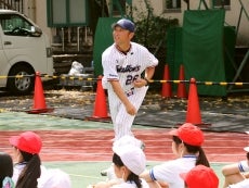 10日(月)、元選手で現・球団職員の河端龍氏が東京都豊島区立豊成小学校を訪問し、毎年春ごろに行われる「スポーツテスト」に向けて、生徒にボールの投げ方を指導しました。