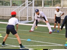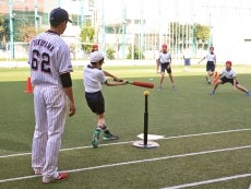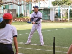 27日(火)、元選手で現・球団職員の河端龍氏と徳山武陽氏が東京都港区立青山小学校を訪問。児童たちへボールの打ち方、捕り方の指導を行いました。