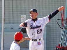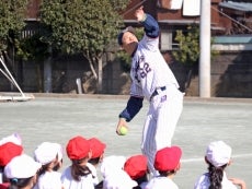 16日(水)、元選手で現・球団職員の河端龍氏と徳山武陽氏が東京都世田谷区にある区立八幡山小学校を訪問。毎年春ごろに行われる「スポーツテスト」に向けて、児童たちへ正しいボールの投げ方を指導しました。