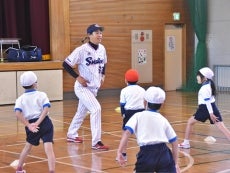 28日(月)、選手で現・球団職員の河端龍氏と徳山武陽氏が東京都文京区にある区立汐見小学校を訪問。毎年春ごろに行われる「スポーツテスト」に向けて、児童たちへ正しいボールの投げ方を指導しました。
