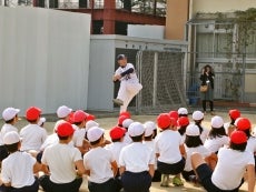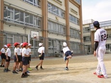 7日(木)、選手で現・球団職員の河端龍氏と徳山武陽氏が東京都江東区にある区立扇橋小学校を訪問。毎年春ごろに行われる「スポーツテスト」に向けて、児童たちへ正しいボールの投げ方を指導しました。