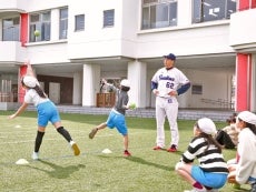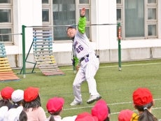 14日(木)、元選手で現・球団職員の河端龍氏と徳山武陽氏が東京都港区にある区立小中一貫教育校お台場学園港陽小学校を訪問。毎年春ごろに行われる「スポーツテスト」に向けて、児童たちへ正しいボールの投げ方を指導しました。