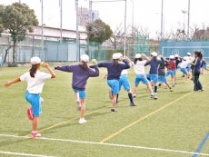この日は4、5年生に向けて2度の授業を実施。腿上げなど準備運動を入念に行い、体を温めます。その後、3段階に分けて投げる動作について説明すると、児童たちは「1、2、3」と大きな声を出しながらフォームを確認していきます。