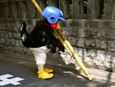 つば九郎は掃除道具を持つと、歩道のゴミや落ち葉を拾うなど隅々まで綺麗に掃除していきます。途中疲れたのか、電信柱で休む姿も見られましたが、何とか気を取り直して清掃活動を再開。商店会付近を歩き回り、街の美化活動に務めました。