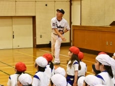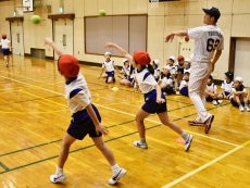29日(水)、元選手で現・球団職員の河端龍氏と徳山武陽氏が東京都港区にある区立芝小学校を訪問。毎年春ごろに行われる「スポーツテスト」に向けて、児童たちへ正しいボールの投げ方を指導しました。
