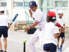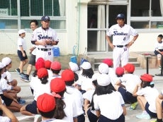 30日(月)、元選手で現・球団職員の度会博文氏、河端龍氏が東京都目黒区にある大岡山小学校を訪問。児童たちへボールの打ち方、捕り方の指導を行いました。