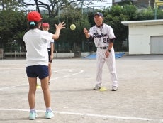 この日は5年生に向けて3回授業を実施。まずはクラスを半分に分け、打ち方を度会氏、捕り方を河端氏が指導していきます。打ち方ではバットの持ち方や、スイングの仕方などを指導。捕り方は捕球の姿勢や手の使い方について説明し、その後は何回キャッチできるか競うゲームなどを行い、ボールに慣れてもらいました。