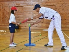 打ち方の練習では、両手を合わせるとバットに見立てて耳の位置から斜め前に振り下ろし、振る動作を覚えていきます。その後は、柔らかいバットを持ち、ティーバッティング。度会氏がお手本を見せると、子供たちも真似をしてボールを打っていきました。