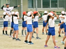 この日は3年生に向けて4度の授業を実施。準備運動を入念に行ったあと「パー、トントン、クル」と3段階に分けて投げる動作を確認していきます。