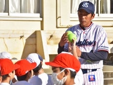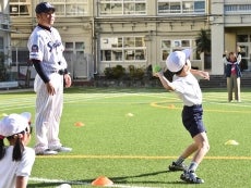 21日(木)、元選手で現・球団職員の度会博文氏と河端龍氏が東京都足立区にある区立栗原小学校を訪問。子供たちへ正しいボールの投げ方を指導しました。