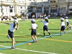 この日は1年生から3年生に向けて3度の授業を実施。はじめに子供たちと「元気な声であいさつすること」「ボールと友達になること」「目を見て話しを聞くこと」の3つの約束をして授業を開始します。