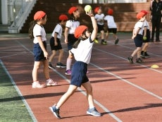 この日は1年生に向けて2度の授業を実施。はじめに、子供たちと「大きく元気な声であいさつすること」「ボールと友達になること」「目を見て話しを聞くこと」の3つの約束をします。準備運動を行うと「パー、トントン、クル」と全員で大きな声を出しながら、3段階に分けて投げる動作について確認していきます。