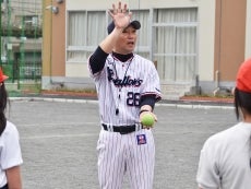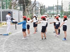 24日(金)、元選手で現・球団職員の河端龍氏と三輪正義氏が東京都江東区にある区立扇橋小学校を訪問。子供たちへボールの打ち方、捕り方の指導を行いました。