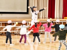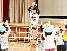 この日は4歳児と5歳児を対象に授業を実施。準備運動を行ったあとは一人一球柔らかいボールを持ちます。河端氏は「ボールを卵だと思って割れないようにね」と指導。園児たちはボールを落とさないように、頭の上や体の周りを回していきます。さらに、上へ向かってボールを投げ、手を叩いてキャッチするなどボールと触れ合い、お友達になっていきます。