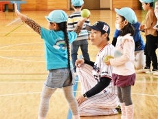 13日(木)、元選手で現・球団職員の河端龍氏と三輪正義氏が東京都渋谷区にある区立広尾幼稚園を訪問。園児たちへ正しいボールの投げ方を指導しました。