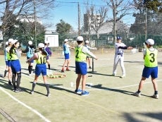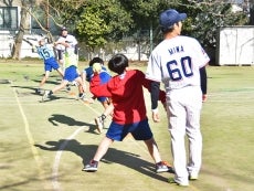 18日(火)、元選手で現・球団職員の河端龍氏と三輪正義氏が東京都文京区にある区立駒本小学校を訪問。毎年春ごろに行われる「スポーツテスト」に向けて、子どもたちへ正しいボールの投げ方・打ち方を指導しました。