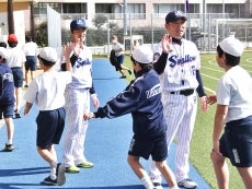 19日(水)、元選手で現・球団職員の河端龍氏と三輪正義氏が東京都渋谷区にある区立渋谷本町学園を訪問。毎年春ごろに行われる「スポーツテスト」に向けて、子供たちへ正しいボールの投げ方を指導しました。
