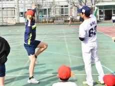20日(木)、元選手で現・球団職員の河端龍氏と三輪正義氏が東京都新宿区にある区立落合第二小学校を訪問。毎年春ごろに行われる「スポーツテスト」に向けて、児童たちへ正しいボールの投げ方を指導しました。