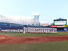 結団式を終えた選手たちは神宮球場へ移動。この日開催される阪神戦の試合開始前に「お披露目会」も行われ、ファンの皆様の前で、年末に明治神宮野球場、横浜スタジアムで行われる「NPB 12球団ジュニアトーナメント大会」での連覇を誓いました。