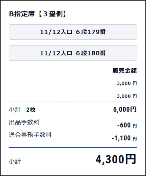 (例)1枚3,000円で2枚のチケットを出品し、リセールが成立した場合