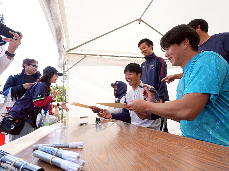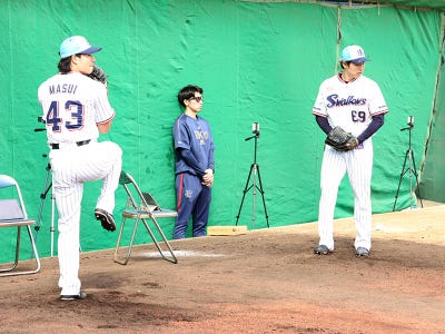 投手陣は清水投手、奥川投手、松本投手、増居投手、下川投手、青柳投手の6投手がブルペンで投球練習を実施。池山監督が見守る中、それぞれ状態を確認しました。また、高梨投手がライブBPに登板し、サンタナ選手、長岡選手を相手に打者相手の投球を行いました。